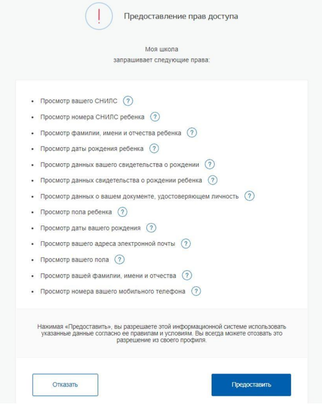 Нажав кнопку «Предоставить», вы даете официальное разрешение Федеральной государственной информационной системе (ФГИС) «Моя школа» на использование предоставленных вами данных для авторизации в системе.