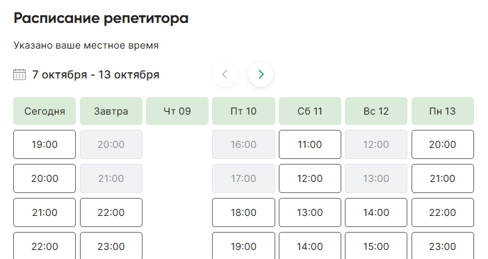 - Расписание: Актуальное расписание доступности, которое позволяет ученикам самостоятельно выбрать удобное для себя время для онлайн-урока.